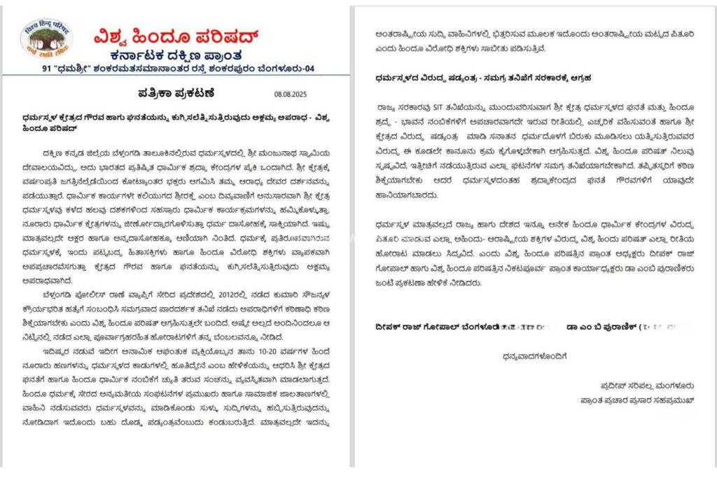 ಧರ್ಮಸ್ಥಳದಲ್ಲಿ ನಡೆಯುತ್ತಿರುವ ಎಸ್ಐಟಿ ತನಿಖೆ ಹಾಗೂ ಇತ್ತೀಚೆಗಿನ ಬೆಳವಣಿಗೆಗಳಿಗೆ ಸಂಬಂಧಿಸಿದಂತೆ ವಿಶ್ವ ಹಿಂದೂ ಪರಿಷತ್ ಖಂಡನೆ ವ್ಯಕ್ತಪಡಿಸಿದೆ. 2012ರಲ್ಲಿ ನಡೆದ ಕುಮಾರಿ ಸೌಜನ್ಯ ಹತ್ಯೆಯ ಆರೋಪಿಗಳಿಗೆ ಶಿಕ್ಷೆ ಆಗಬೇಕು. ಆ ಸಂಬಂಧ ನಡೆದ ಎಲ್ಲಾ ಪ್ರತಿಭಟನೆಗಳಲ್ಲಿ ವಿಶ್ವಹಿಂದೂ ಪರಿಷತ್ ಭಾಗವಹಿಸಿದೆ. ಆದರೆ ಇದೀಗ ಆಗಂತುಕ ವ್ಯಕ್ತಿಯೋರ್ವ ತಾನು 10-20 ವರ್ಷದ ಹಿಂದೆ ನೂರಾರು ಹೆಣಗಳನ್ನು ಹೂತುಹಾಕಿದ್ದೇನೆ ಎಂದು ಹೇಳಿಕೆ ನೀಡಿದ್ದಾನೆ. ಈ ಹೇಳಿಕೆ ಆಧರಿಸಿ ಕ್ಷೇತ್ರದ ಘನತೆಗೆ ಚ್ಯುತಿ ತರುವ ಸಂಚು ನಡೆಸಲಾಗುತ್ತಿದೆ ಎಂದು ಕಿಡಿಕಾರಿದ್ದಾರೆ.