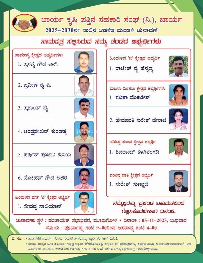 ಬಾರ್ಯ : (ನ.05 ) ಬಾರ್ಯ ಕೃಷಿ ಪತ್ತಿನ ಸಹಕಾರಿ ಸಂಘ (ನಿ.) 2025-2030 ನೇ ಸಾಲಿನ ಆಡಳಿತ ಮಂಡಳಿ ನಿರ್ದೇಶಕರ ಚುನಾವಣೆ ನವೆಂಬರ್ 05 ರಂದು ಮೂರುಗೋಳಿ ಪಂಚಾಯತ್ ಸಭಾಭವನದಲ್ಲಿ ನಡೆಯಿತು. ಚುನಾವಣಾ ಅಧಿಕಾರಿ ಫಲಿತಾಂಶ ಘೋಷಣೆ ಮಾಡಿದರು.
