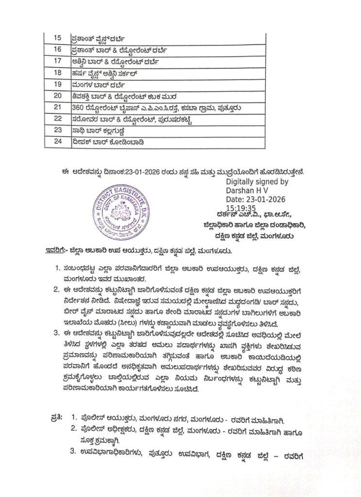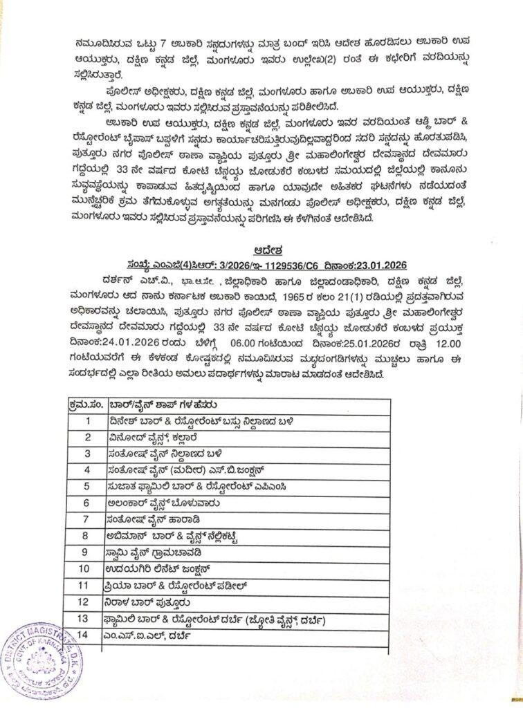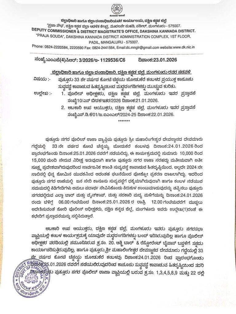 ಪುತ್ತೂರು ನಗರ ಠಾಣಾ ಸರಹದ್ದು ಮತೀಯವಾಗಿ ಅತೀ ಸೂಕ್ಷ್ಮ ಪ್ರದೇಶವಾಗಿರುವುದರಿಂದ ಸಾರ್ವಜನಿಕ ಶಾಂತಿ ಸುವ್ಯವಸ್ಥೆ ಕಾಪಾಡುವ ಹಿತದೃಷ್ಟಿಯಿಂದ, ಪುತ್ತೂರು ನಗರ ಠಾಣೆಯಲ್ಲಿ ಜನ ಸೇರಿ ಕಾನೂನು ಸುವ್ಯವಸ್ಥೆಗೆ ಧಕ್ಕೆಯಾಗಿರುವುದಾಗಿ ಹಾಗೂ ಕಂಬಳ ನಡೆಯುವ ಸಮಯದಲ್ಲಿ ಕಿಡಿಗೇಡಿಗಳು ಅಮಲು ಪದಾರ್ಥ ಸೇವಿಸಿಕೊಂಡು ಕಿರುಕುಳ ಉಂಟುಮಾಡುವುದನ್ನು ತಪ್ಪಿಸಲು ಪುತ್ತೂರು ನಗರದಲ್ಲಿರುವ ಎಲ್ಲಾ ಬಾರ್ ಮತ್ತು ವೈನ್ಶಾಪ್, ಮದ್ಯ ಅಂಗಡಿಗಳನ್ನು ಜನವರಿ 24 ರಂದು ಬೆಳಿಗ್ಗೆ 6 ಗಂಟೆಯಿಂದ 25 ರ ರಾತ್ರಿ 12 ಗಂಟೆಯವರೆಗೆ ಮುಚ್ಚಲು ಹಾಗೂ ಅಮಲು ಪದಾರ್ಥಗಳನ್ನು ಮಾರಾಟ ಮಾಡದಂತೆ ಜಿಲ್ಲಾಧಿಕಾರಿ ದರ್ಶನ್ ಹೆಚ್.ವಿ ಆದೇಶಿಸಿದ್ದಾರೆ.
