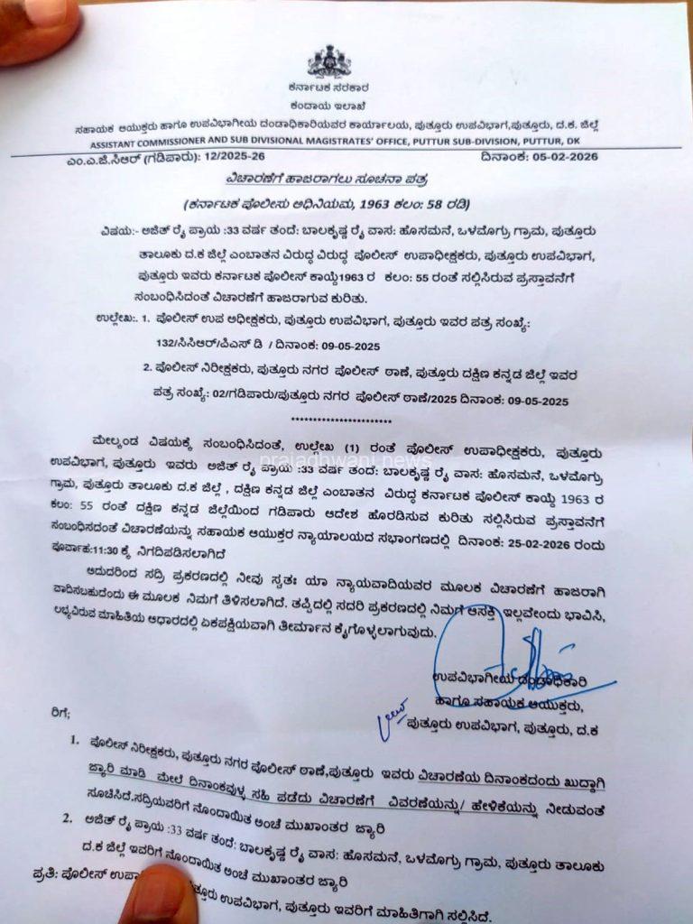 ಒಳಮೊಗ್ರು ಗ್ರಾಮ ಹೊಸಮನೆ ನಿವಾಸಿ ಅಜಿತ್ ರೈ ವಿರುದ್ಧ ಪುತ್ತೂರು ಉಪವಿಭಾಗದ ಪೊಲೀಸ್ ಉಪಾಧೀಕ್ಷಕರು ಕರ್ನಾಟಕ ಪೊಲೀಸ್ ಕಾಯ್ದೆ 1963ರ ಕಲಂ 55ರಂತೆ ದಕ್ಷಿಣ ಕನ್ನಡ ಜಿಲ್ಲೆಯಿಂದ ಗಡಿಪಾರು ಆದೇಶ ಹೊರಡಿಸುವ ಕುರಿತು ಸಲ್ಲಿಸಿರುವ ಪ್ರಸ್ತಾವನೆಗೆ ಸಂಬಂಧಿಸಿದಂತೆ ವಿಚಾರಣೆ ಸಹಾಯಕ ಆಯುಕ್ತರ ನ್ಯಾಯಾಲಯದ ಸಭಾಂಗಣದಲ್ಲಿ ಫೆ.25ರಂದು ನಡೆಯಲಿದೆ. ಸದ್ರಿ ಪ್ರಕರಣದಲ್ಲಿ ಸ್ವತಃ ಯಾ ನ್ಯಾಯವಾದಿಯವರ ಮೂಲಕ ವಿಚಾರಣೆಗೆ ಹಾಜರಾಗಿ ವಾದಿಸಬಹುದೆಂದು, ತಪ್ಪಿದಲ್ಲಿ ಸದ್ರಿ ಪ್ರಕರಣದಲ್ಲಿ ಆಸಕ್ತಿ ಇಲ್ಲವೆಂದು ಭಾವಿಸಿ, ಲಭ್ಯವಿರುವ ಮಾಹಿತಿಯ ಆಧಾರದಲ್ಲಿ ಏಕಪಕ್ಷಿಯವಾಗಿ ತೀರ್ಮಾನ ಕೈಗೊಳ್ಳಲಾಗುವುದು ಎಂದು ತಿಳಿಸಲಾಗಿದೆ.